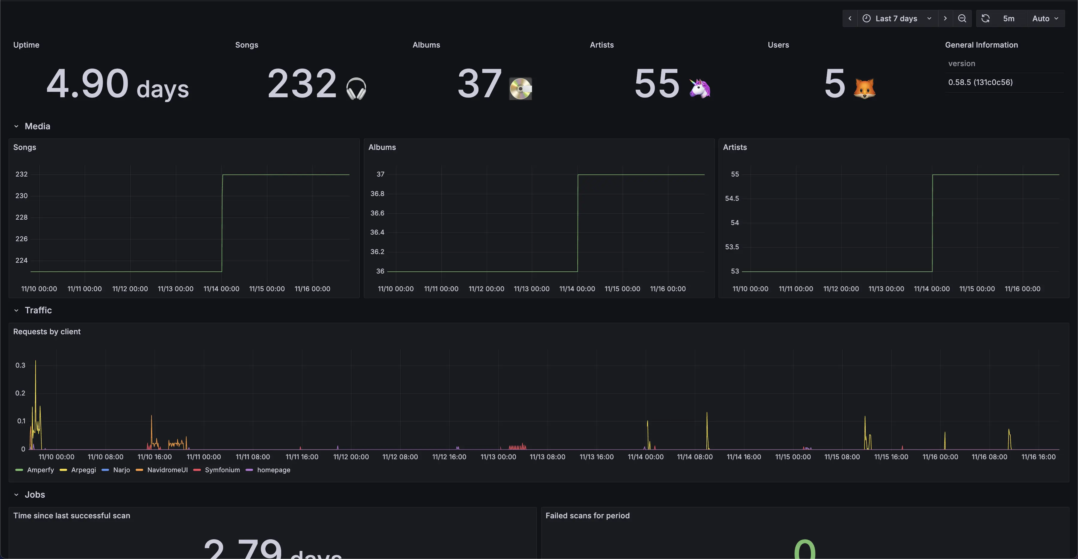Currently, Navidrome supports monitoring and alerting using Prometheus/OpenMetrics standard. Example Grafana dashboard: